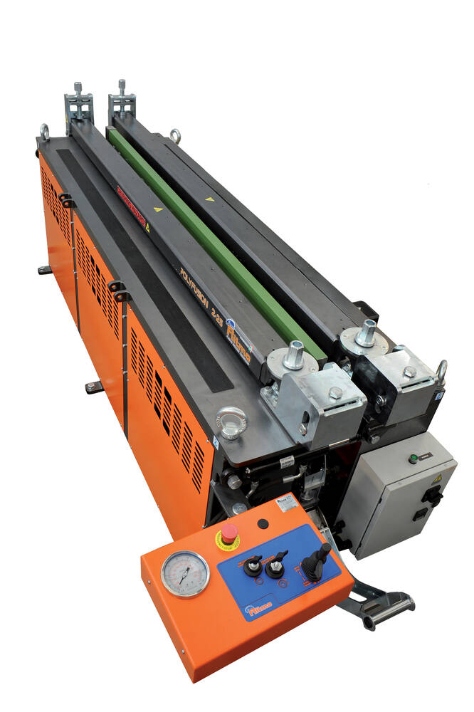je hydraulická svářečka na HDPE a PP desky. Umožňuje svařovat desky do šířky 2 m a tloušťky 3 mm až 25 mm. Stroj dokáže svařovat i dvoustěnné desky.