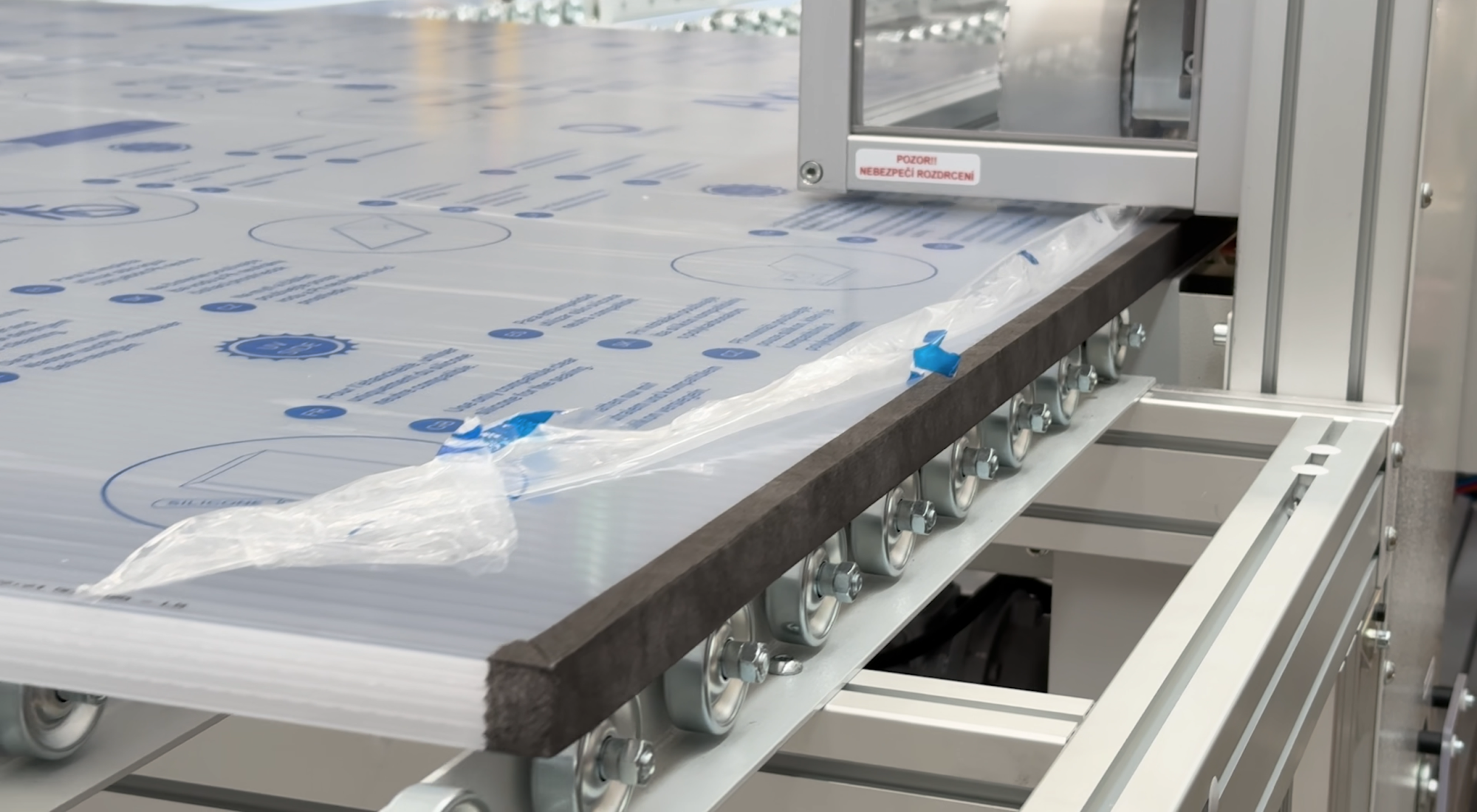 Automatická olepovačka slouží k přesné aplikaci ochranné pásky na polykarbonátové desky. Materiál je veden strojem, kde je páska rovnoměrně nanášena a pomocí přítlačných válců pevně přichycena na hranu.
